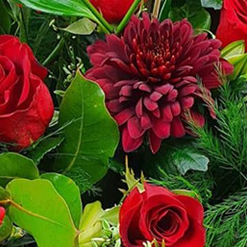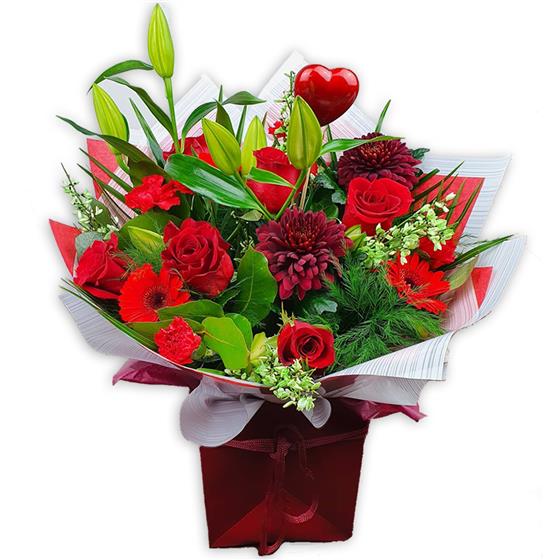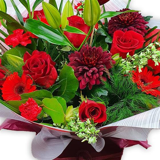 Warm crimson roses and bold burgundy blooms meet delicate lilies, red carnations and bright gerbera daisies, entwined with fresh greenery and dotted with white waxflower for gentle, heartfelt charm.