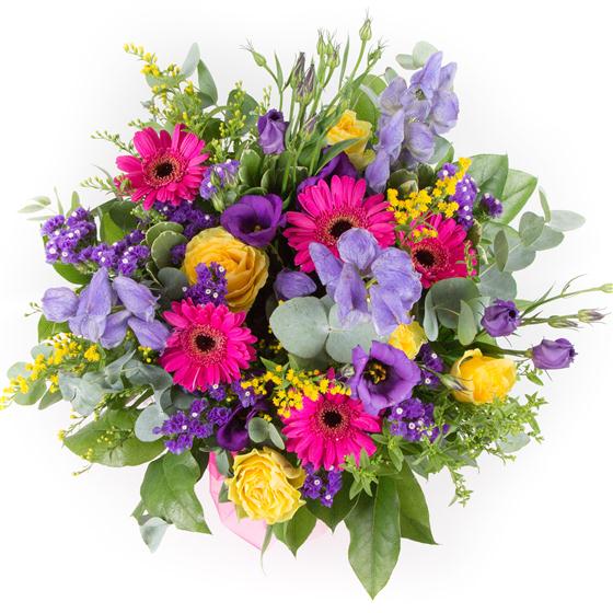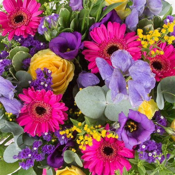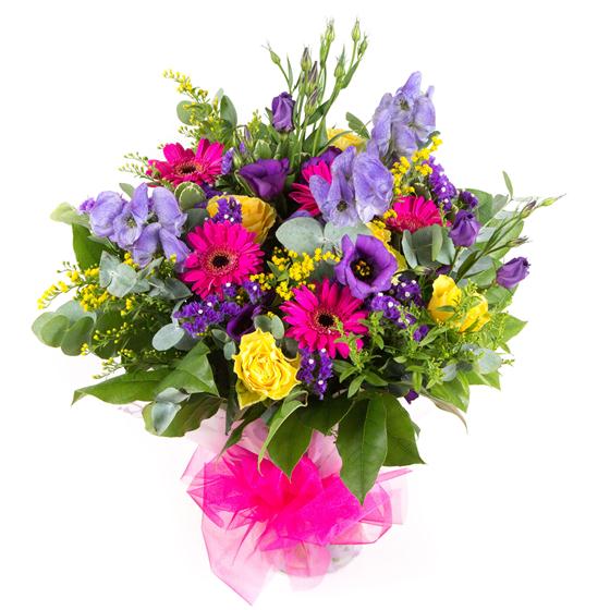 Send a splash of colour with this bright and cheerful cerise, gold and purple hand-tied bouquet.