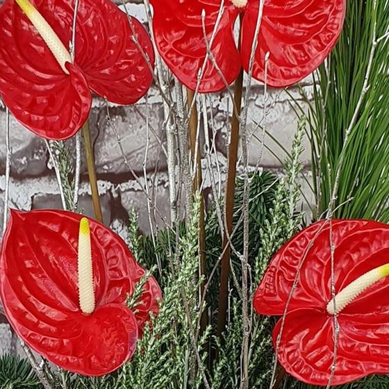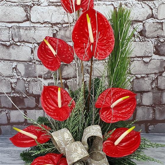 A striking Christmas arrangement featuring bold red anthuriums, winter foliage and elegant seasonal accents. Designed with a modern festive style, perfect for creating a stylish statement throughout the holiday season.