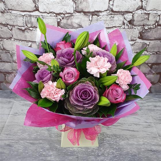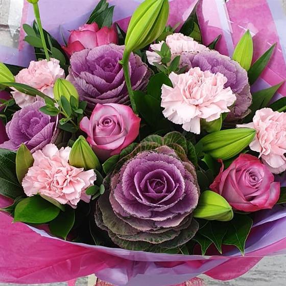 A soft and elegant Christmas arrangement filled with gentle pink tones, frosted purples and fresh winter greens. Designed in a warm festive style, perfect for bringing seasonal joy into the home.