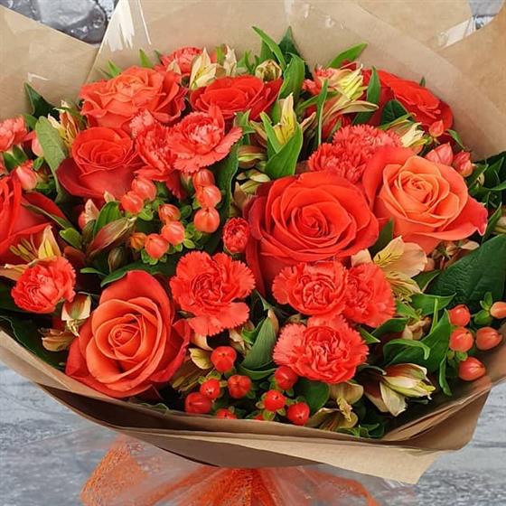 A warm and cheerful Christmas bouquet filled with glowing orange roses, festive carnations, and seasonal berries, all arranged with rich green foliage for a bright and joyful look. Perfect for adding a vibrant touch to the season.