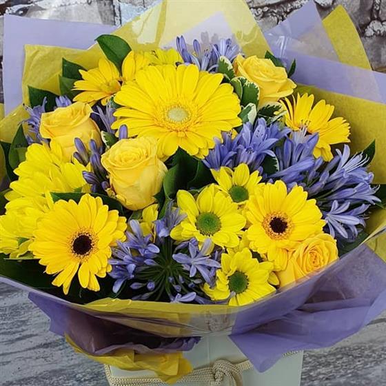 A bright Christmas arrangement filled with golden blooms, soft lilac tones and fresh winter greens. Designed with a cheerful festive style, perfect for bringing warmth and colour to the holiday season.
