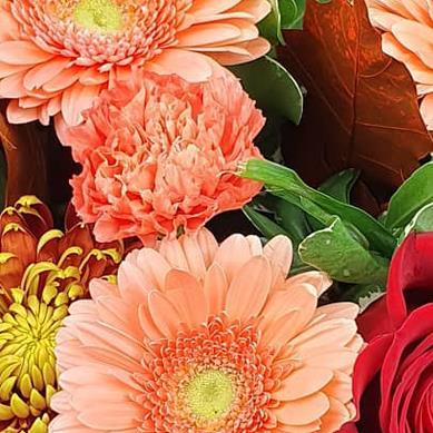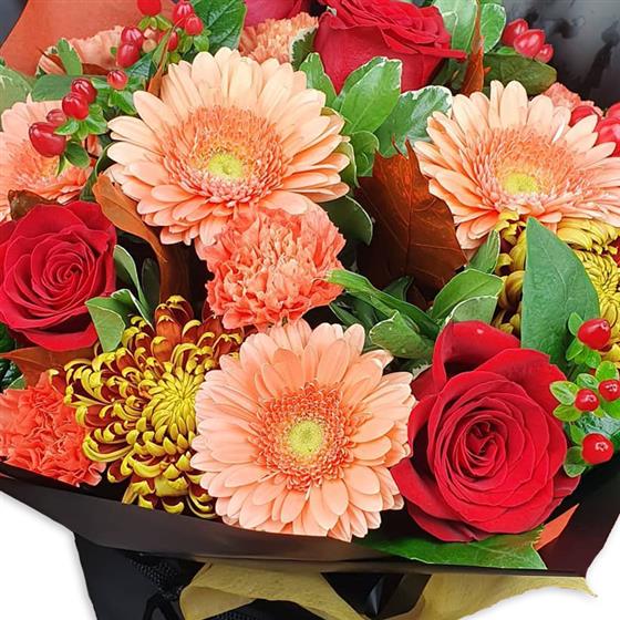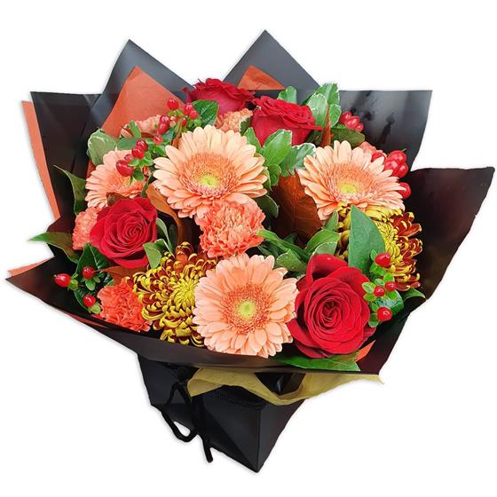 A warm, seasonal flower bouquet blending peach gerberas, rich red roses and textured chrysanthemum blooms. Finished with berries and foliage, this design has a cosy, autumnal feel with strong colour and depth.