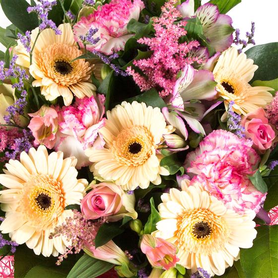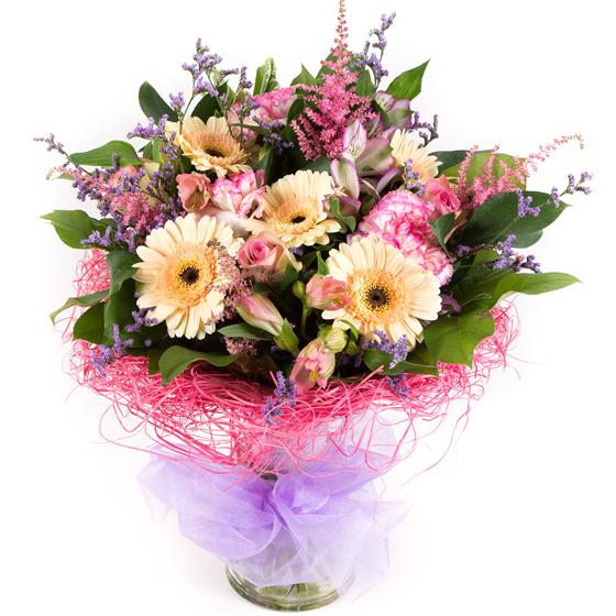 A delightful, compact bouquet of pretty lilac, pink and peach flowers in a sisal wrap presented in a glass vase.