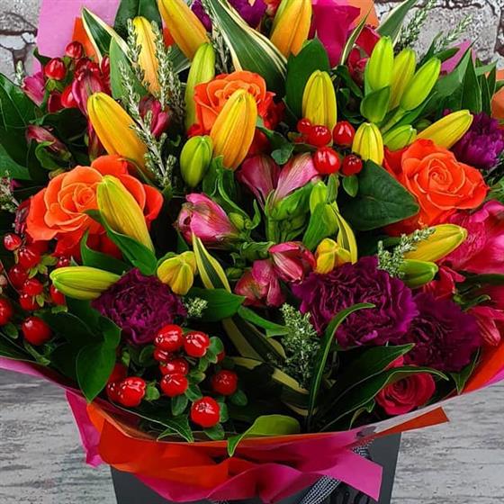 A bold festive arrangement packed with warm Christmas colour. Bright berry reds, glowing oranges and lush winter greens combine to create a lively seasonal display. Every stem is arranged by hand using fresh flowers and natural festive textures, perfect for gifting throughout the Christmas season.