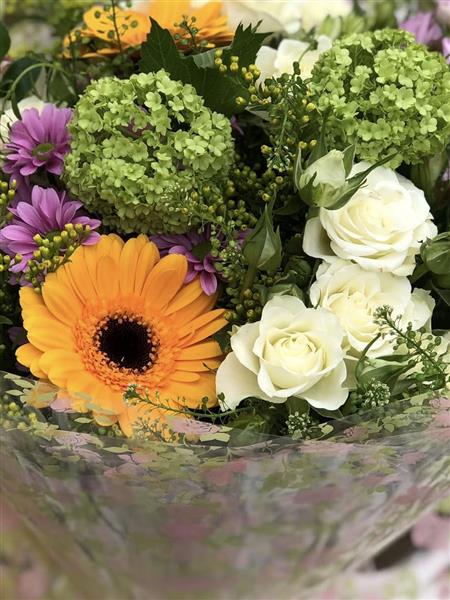 A gentle blend of white roses, lilac flowers, gerbera and hydrangea with airy greens, creating a soft, uplifting bouquet inspired by a sunny garden morning.