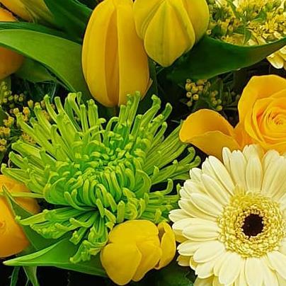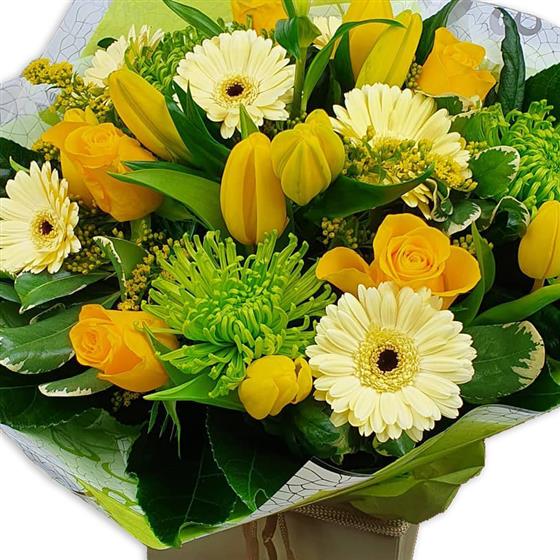 Design includes yellow roses, yellow tulips, cream gerbera, vibrant green chrysanthemum blooms, soft yellow filler flowers and glossy green foliage, arranged into a fresh, uplifting bouquet with clean colour, texture and natural balance.