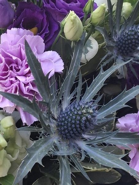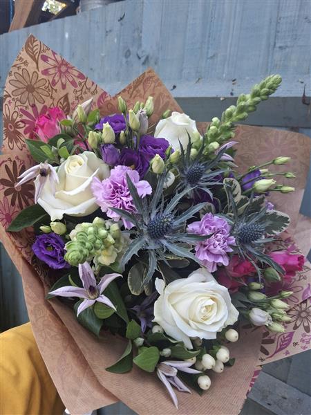 A soft coastal-inspired mix of ivory roses, lilac carnations, thistles, lisianthus and snapdragons, arranged with natural movement and cool Hampshire tones.