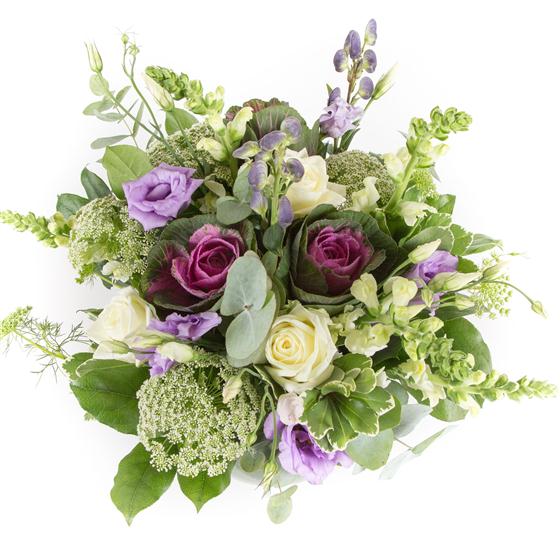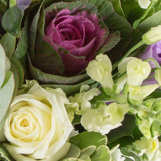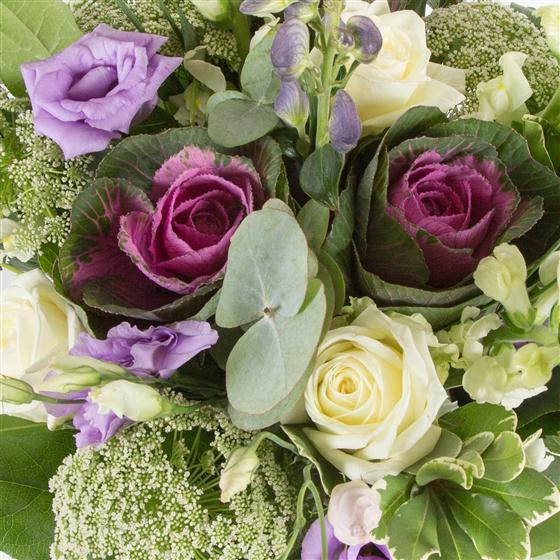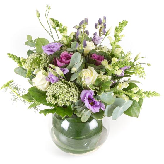 A stylish hand-tied arrangement of whites and lilacs, including roses and aconitum presented in a delightful glass bowl.