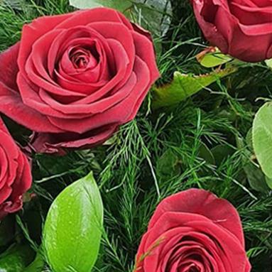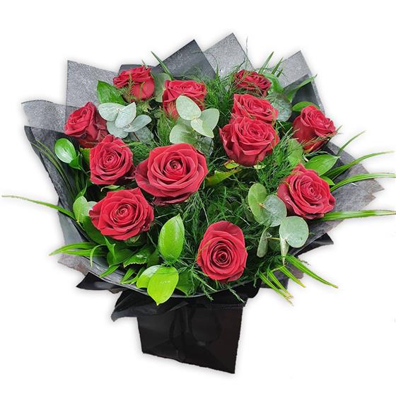 12 luxury red roses accentuated by feathery asparagus fern and tender eucalyptus, tied with paper wrap for whisper-soft luxury.