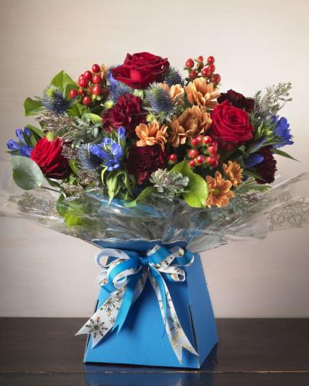 A bold flower bouquet with red roses, bronze blooms and striking blue highlights arranged with fresh greens for a warm, confident finish.