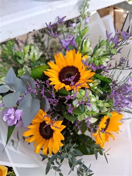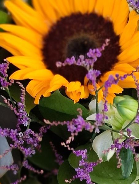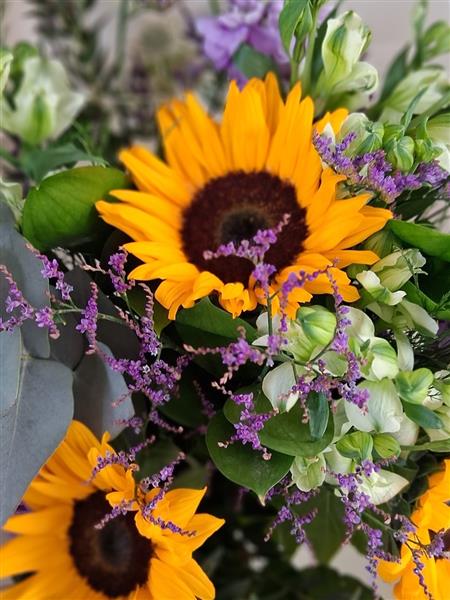 Golden sunflowers mixed with lilac tones, alstroemeria and silvery eucalyptus, creating a warm and cool colour contrast with soft countryside charm.