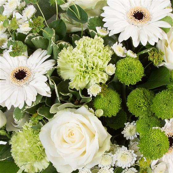 Vibrant limes and whites contrast to make this stylish hand-tied bouquet presented in a gift bag.