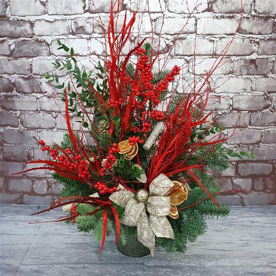 A striking Christmas arrangement filled with vibrant red berries, seasonal evergreens and tall festive twigs, finished with touches of dried orange and a luxury ribbon. Designed to bring bold colour and classic winter warmth into the home for the holiday season.