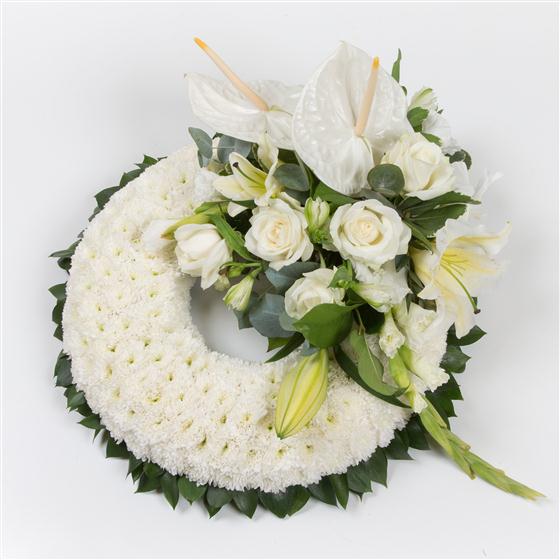 A large, modern spray of flowers available in your choice of colours is the focal point of this classic wreath.