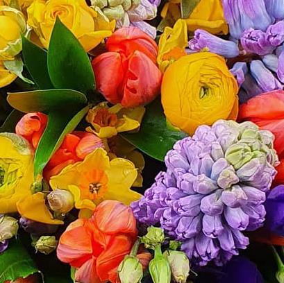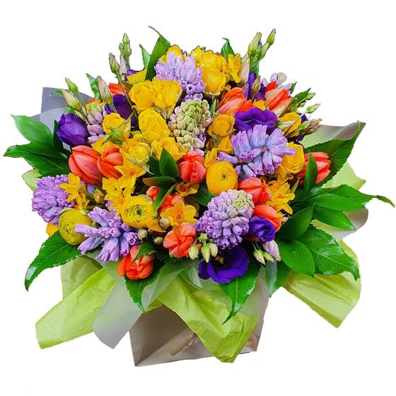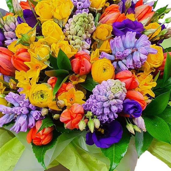 A vibrant mixed flower arrangement featuring spray roses, tulips, hyacinths, lisianthus and seasonal spring blooms, layered with fresh green foliage. Packed with bold colour, texture and energy, designed for a bright, uplifting finish.