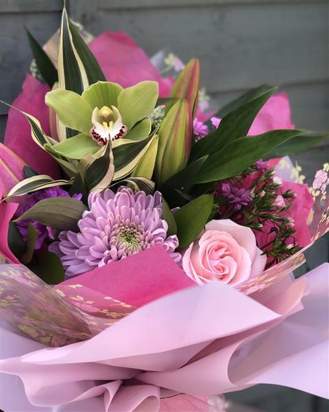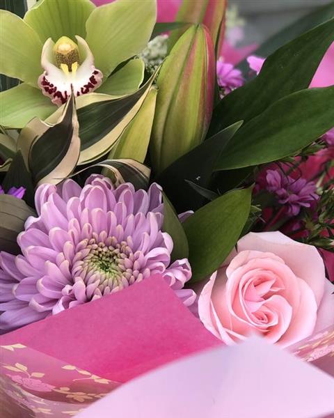 A graceful mix of green cymbidium orchid, pink roses, lilies, lilac chrysanthemum and soft foliage, arranged with gentle colour and elegant, fresh styling.