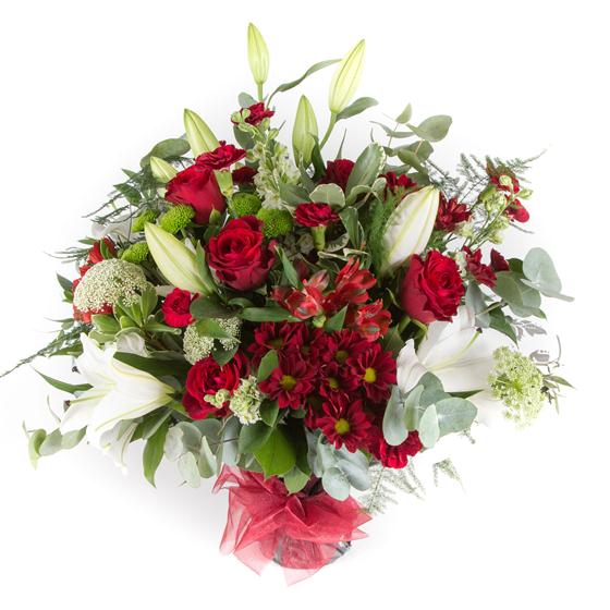 An exotic collection including red roses, oriental lilies with a variety of red and lime blooms and foliage.
