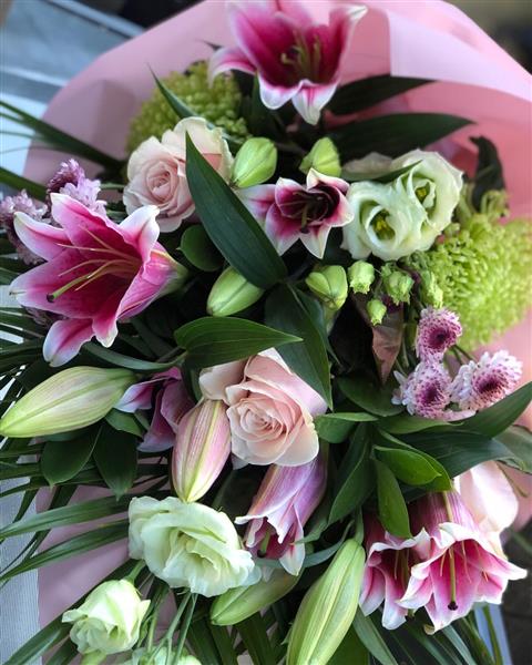 Pink oriental lilies, soft roses, lisianthus and green chrysanthemum arranged with flowing foliage for a graceful bouquet full of movement, colour and elegant detail.