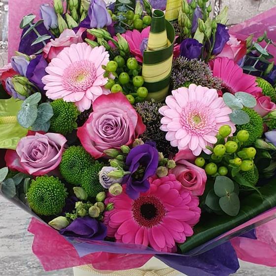 A vibrant bouquet filled with fresh pinks, purples and lush greens. Bold, cheerful and full of colour, arranged using fresh flowers and natural style for everyday gifting.