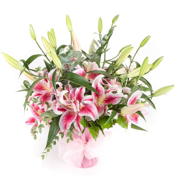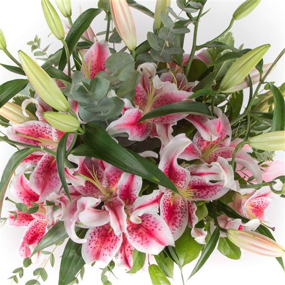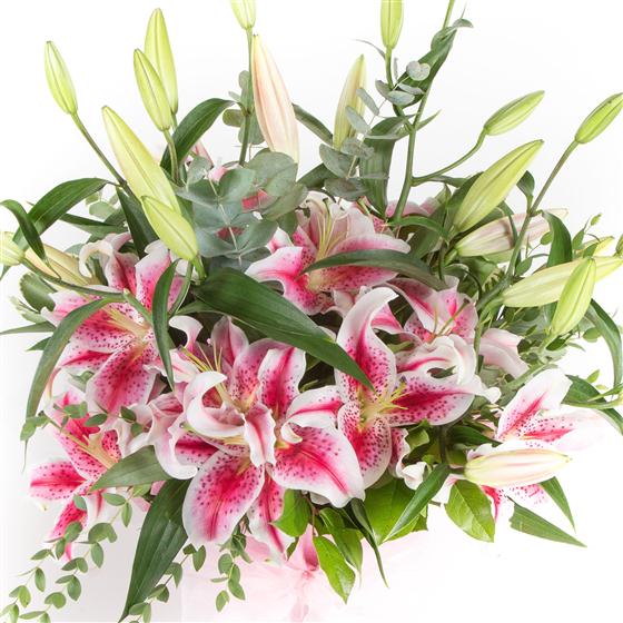 Pink stargazer lilies combined with mixed greenery are all this bouquet needs to make a stunning display of highly perfumed blooms.