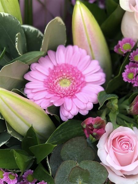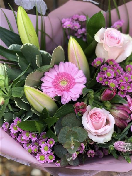 Pink roses, gerbera, chrysanthemums, lilies and waxflower arranged with eucalyptus for a gentle, elegant bouquet full of soft colour and natural movement.