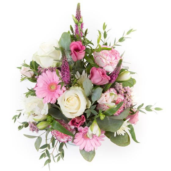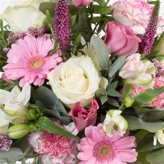 A delightful arrangement in pastel pinks and creams, including roses, veronica, mini gerberas and eucalyptus.