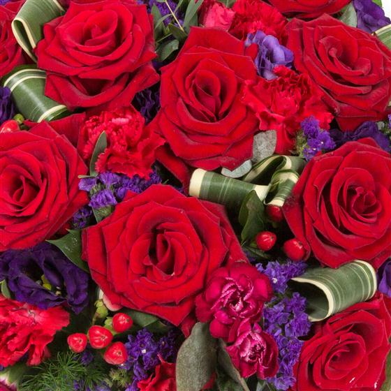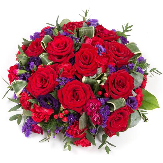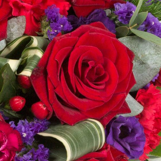 An all round posy arrangement of deep red roses, spray carnations and hypericum berries mixed with vibrant purple statice and lisianthus.