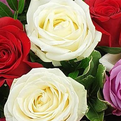 Brighten any space with classic red, creamy white and soft lilac roses arranged with fresh green foliage, forming a well-balanced bouquet that blends bold colour with gentle tones and a clean, elegant finish.