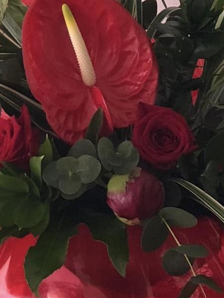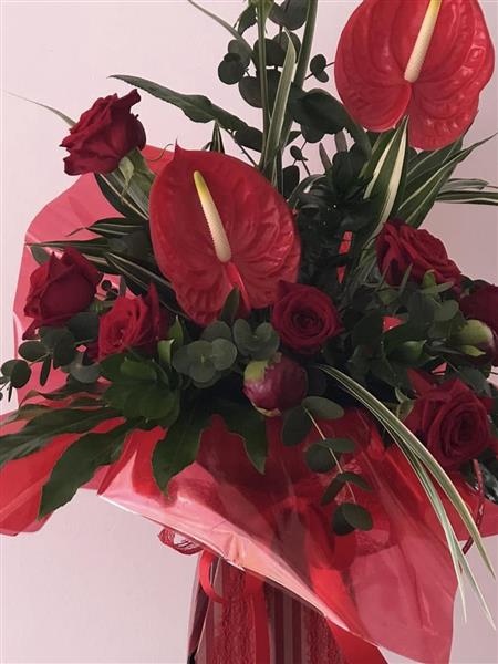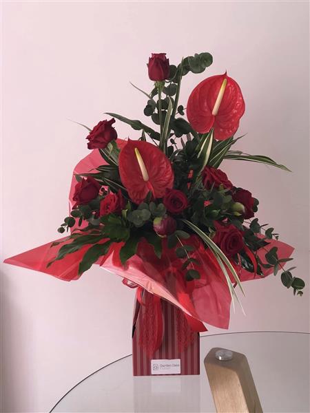 Striking red anthuriums, luxury red roses and rich foliage arranged in a tall, sculpted design, creating a bold, dramatic bouquet full of depth and glamour.