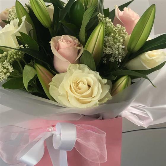 Lily buds, pink roses, ivory roses and delicate white stems arranged neatly with fresh foliage for a simple, refined bouquet with a soothing finish.
