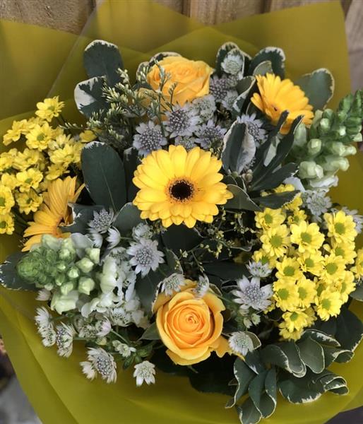 A sunny collection of gerbera, roses and yellow sprays paired with cool astrantia and lush foliage for a cheerful, modern bouquet.