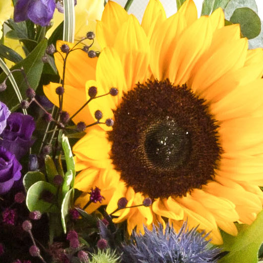 A magnificent arrangement of bright yellow sunflowers, gladioli, aconitum and lime green chrysanthemums.