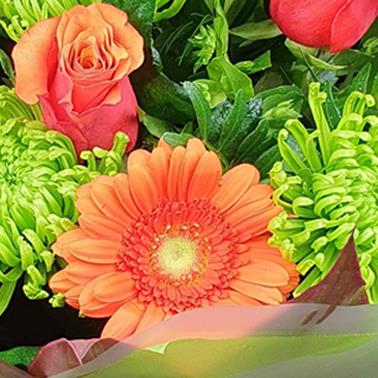 Soft orange roses, coral gerberas and green spider mums mingle with peach carnations and lush greenery for a warm, uplifting bouquet that brightens any space with gentle, sunlit charm.