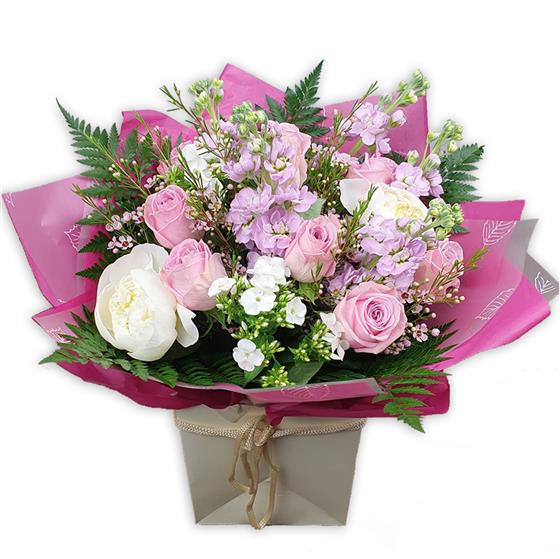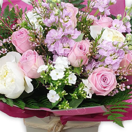 Blush roses, creamy peony and delicate white phlox paired with pale pink stock, tiny waxflower and lush fern fronds evoke gentle, poetic beauty.