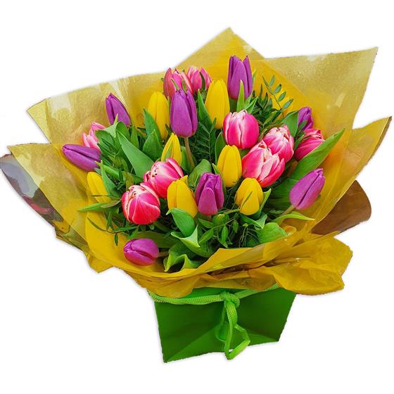 Design includes mixed pink, purple and yellow tulips arranged with fresh green foliage, creating a bright, uplifting bouquet full of spring colour, clean lines and natural freshness.