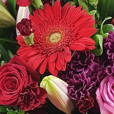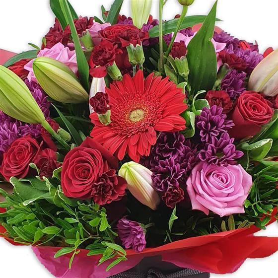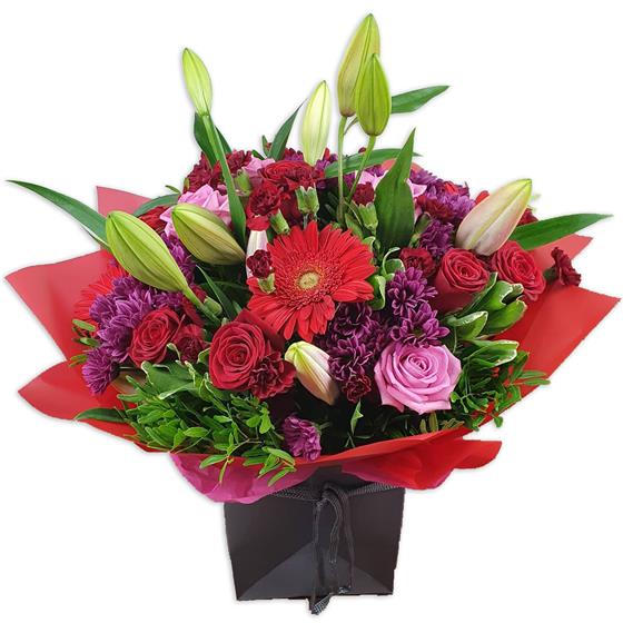 A rich and dramatic flower bouquet filled with deep reds, berry tones and soft pink highlights. Designed with roses, gerbera and lilies, balanced with textured blooms and lush foliage for a striking, luxurious finish.