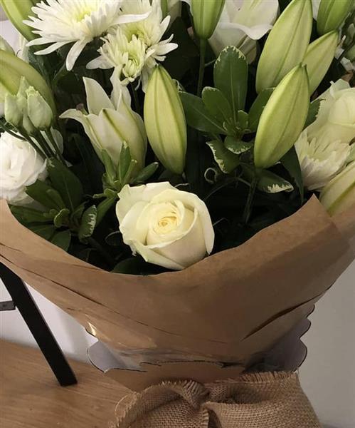 White roses, lilies, chrysanthemums and lisianthus arranged with deep green foliage for a crisp, elegant bouquet full of calm, timeless beauty.