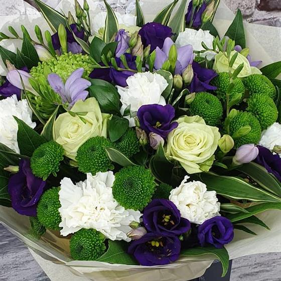 A beautiful Christmas arrangement filled with soft winter whites, rich purples and fresh green tones, arranged with a calm festive style. A peaceful and elegant design perfect for celebrating the season.